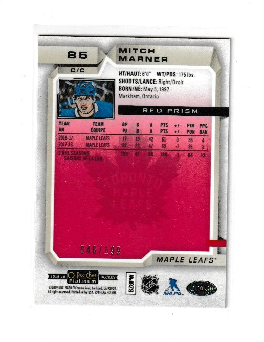 2018-19 O-Pee-Chee Platinum Red Prism #85 Mitch Marner. Numbered 046/199