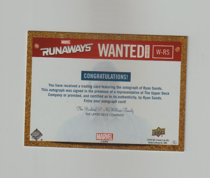 2020 Marvel's Runaways Wanted Autographs #W-RS Ryan Sands as Geoffrey Wilder